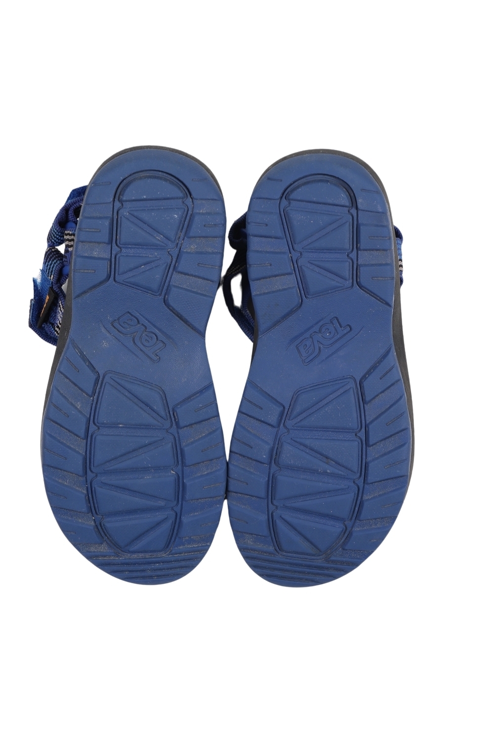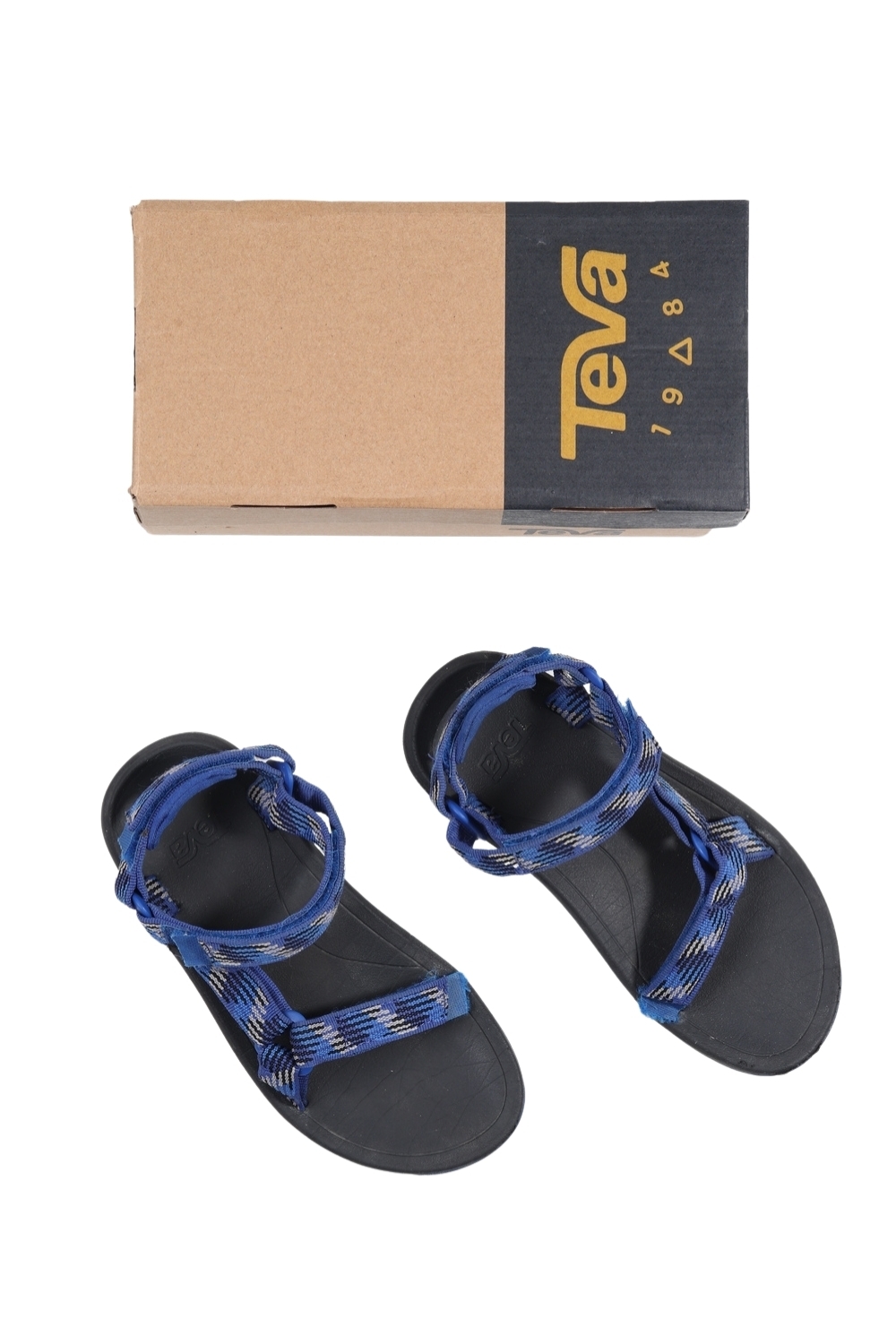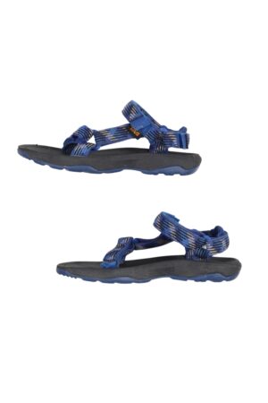 Blauw-zwarte trekkingsandalen “Hurricane”. Sterke stoffen bandjes met velcrosluiting aan enkel, wreef en bij de tenen. Zolen met reliëf voor extra grip. Sandalen geschikt om in het water te dragen.