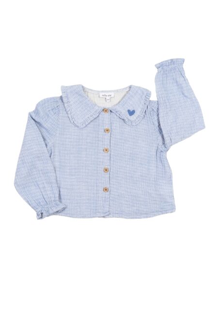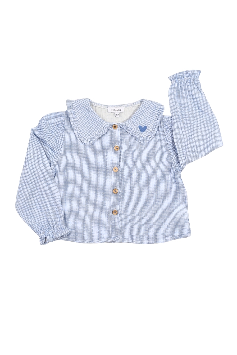 Wit bloesje in tetrastof met fijne blauw ruitjespatroon. Leuke ronde kraag met frulle en geborduurd hartje. Bruine houten knoojes en elastiekje aan de polsboorden.