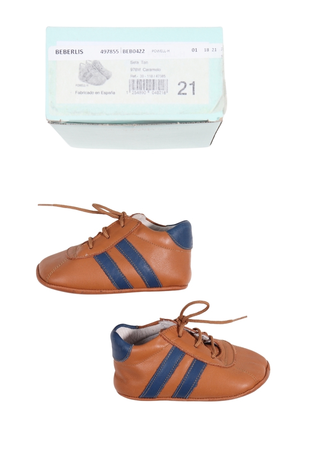 Camel lederen schoentjes met veters en blauwe strepen. Antislipzool.