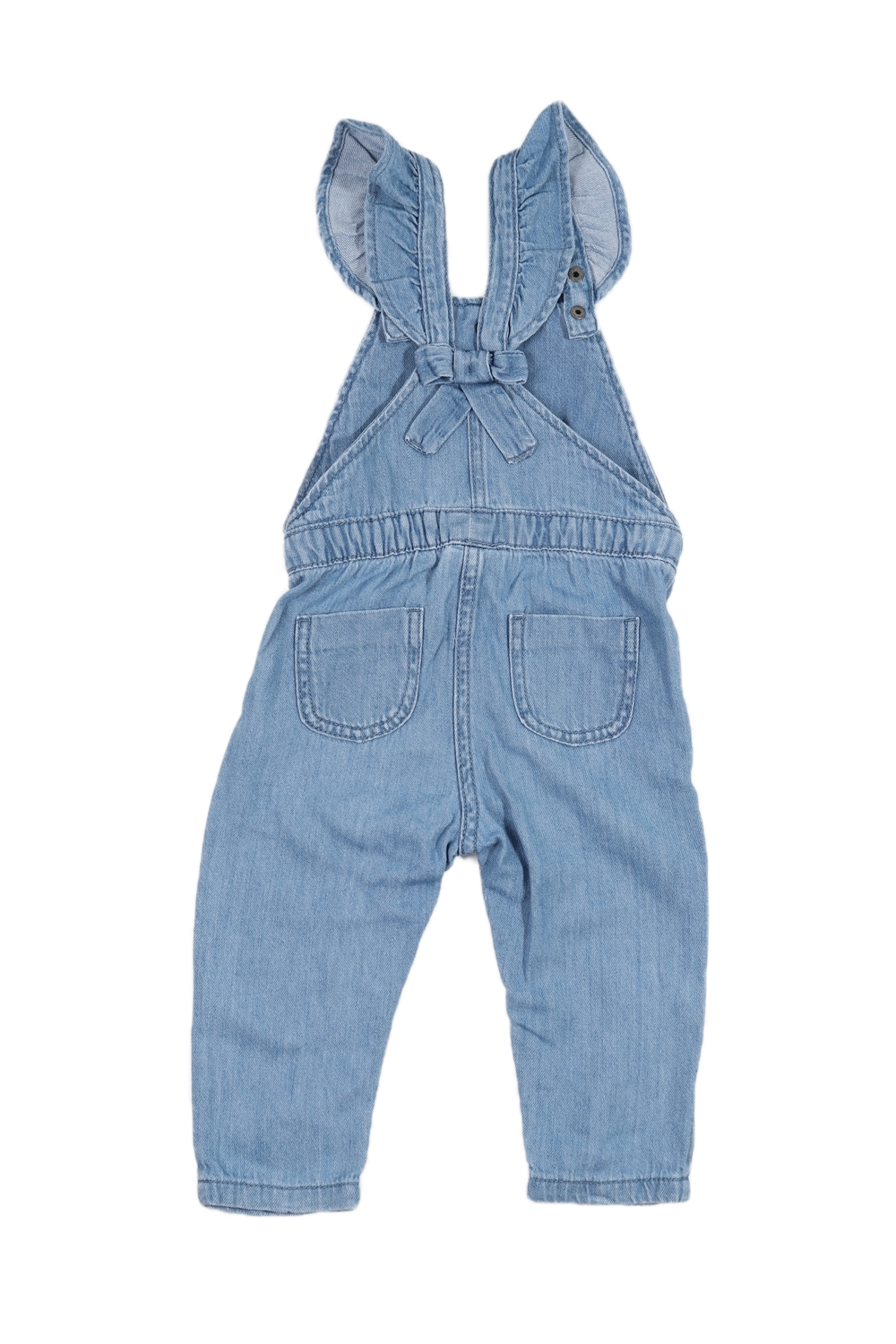 Denim salopette in zacht stofje. Met leuke knopen, frulletje aan de verstelbare schouderbandjes en strik op de rug. Rekkertje in de taille en sluit met drukknoopjes tussen de beentjes. Cuddles and Smiles by JBC. Mooie staat.