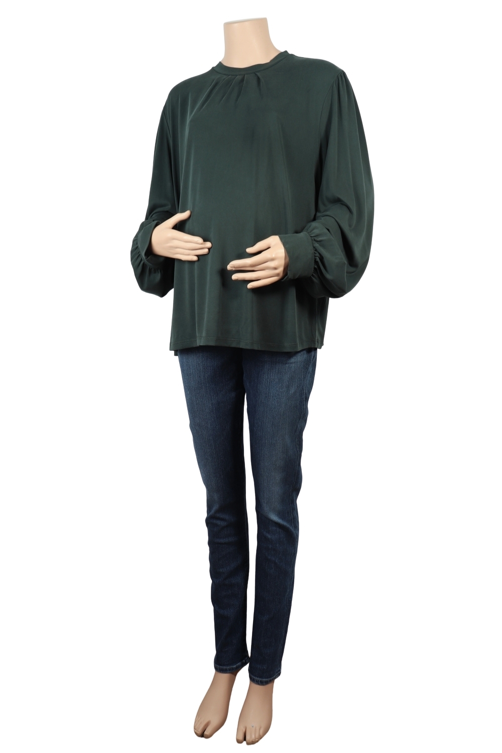 Donkergroene bloes in soepelvallende stof. Met ronde hals en druppeluitsnijding en 2 knoopjes in de nek. Leuke ballonmouwen.