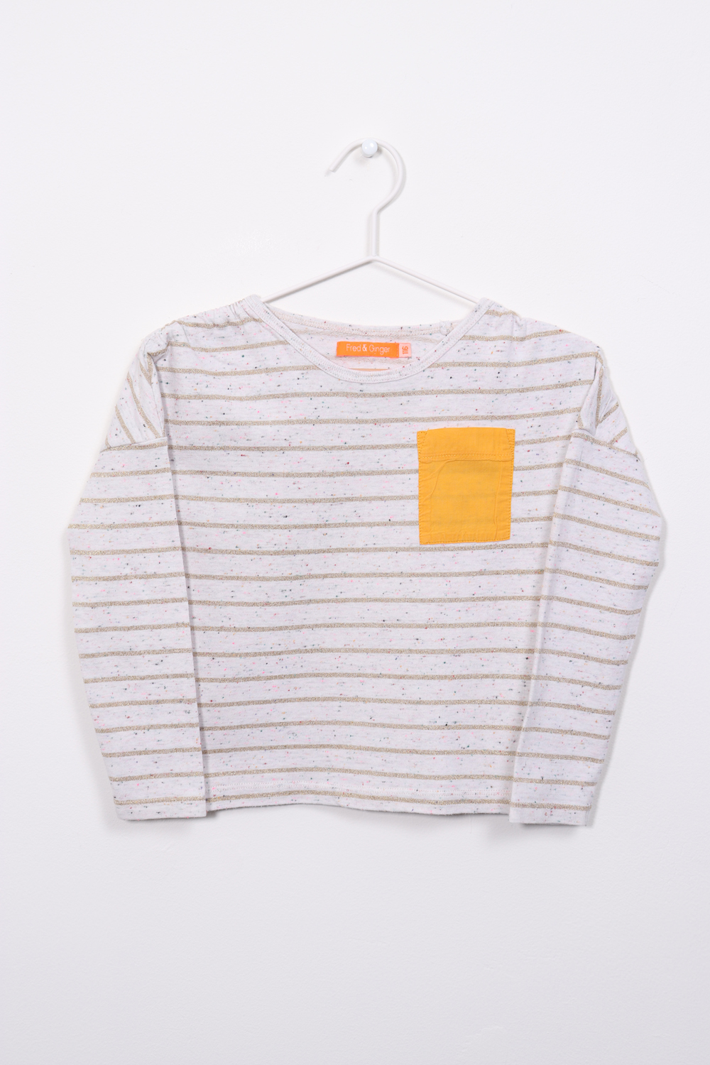 Ecru longsleeve met gouden glitterstreepje. Oker opzetzakje.