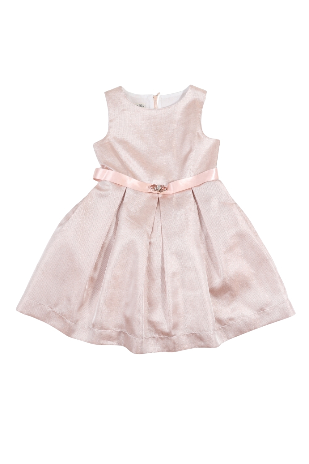 Oudroze mouwloos feestkleedje met metallic ingeweven draad. Gecentreerd in de taille en met plooien op de rok. Gevoerde rok en met extra tulelaag. Satijnen lint met parelbroche in de taille die afneembaar is. Sluit met ritsje op de rug.
