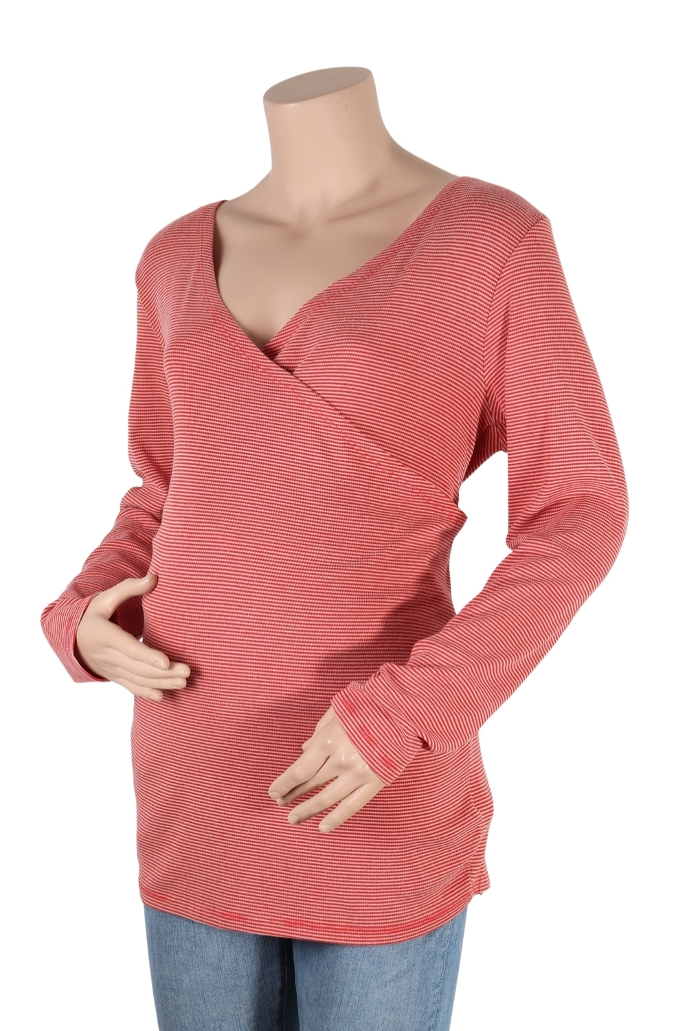 Rood-lichtbruin gestreepte longsleeve in geribde stretchstof. Met cache-coeur hals om ook makkelijk borstvoeding te kunnen geven.