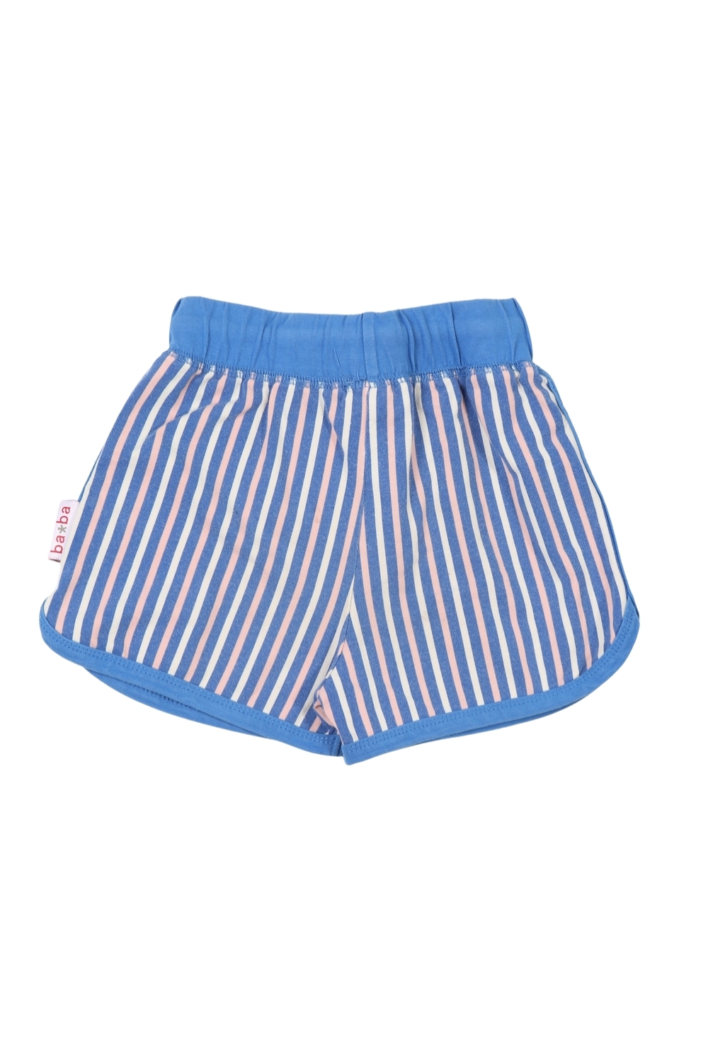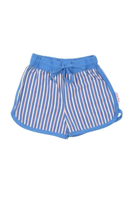 Blauw-roze gestreepte short. Met rekker in de taille en aantrekkoordje.