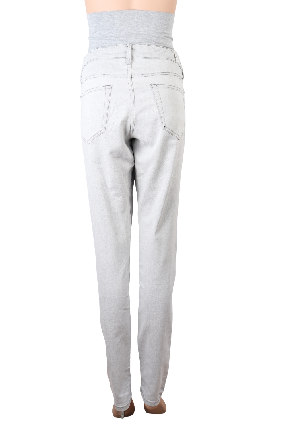 Lichtgrijze jeans met zakken en knoop. Stoffen elastische buikband en verstelbare rekker in de taille.
