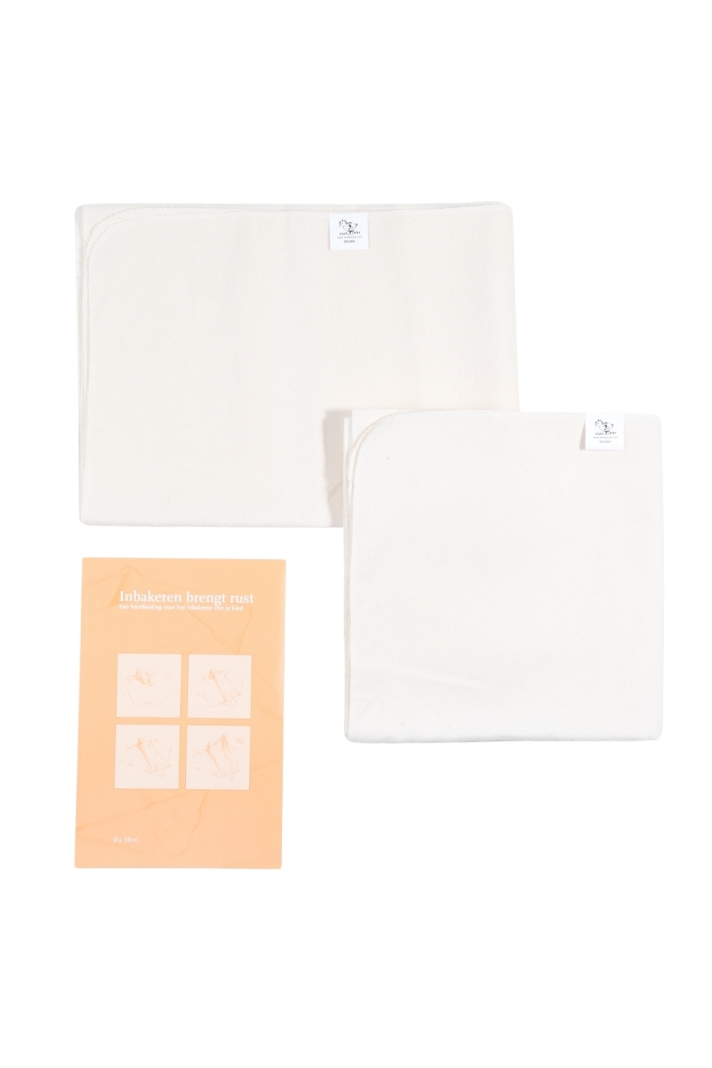 Set van 2 inbakerdoeken in zacht biokatoen (100×100 cm en 100×70 cm). Met boek “Inbakeren brengt rust” van Ria Blom.