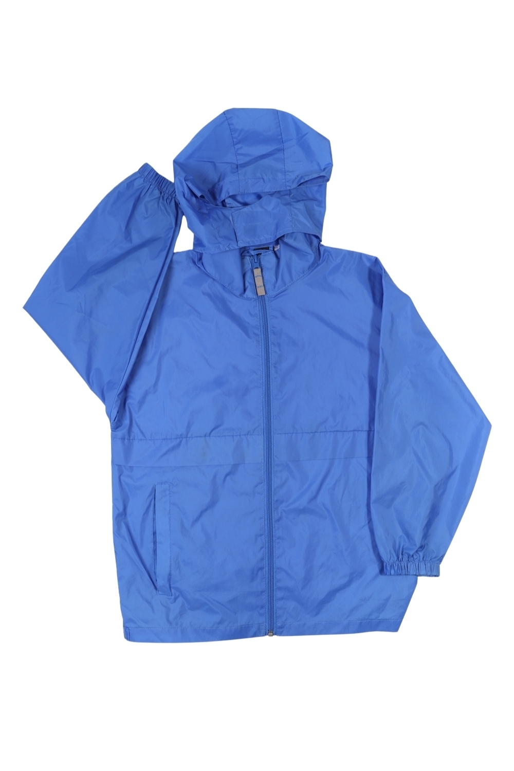 Set van blauwe regenjas en donkerblauwe regenbroek. Regenjas met kap die kan opgeborgen worden. Jas kan compact samengevouwen worden, in jaszak worden gestopt en rond de taille worden gedragen met rekkerriem. Regenbroek met ritsen onderaan om makkelijk aan te trekken. Rekker en aantrekkoordje in de taille. Reflecterende stroken aan de broek. Zakje met rits achteraan.