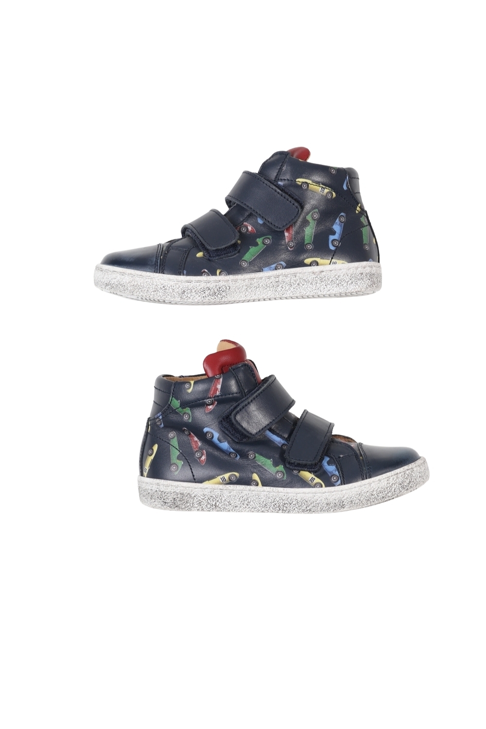 Donkerblauwe schoenen met kleurrijke retroracewagens. Sluit met velcrosluiting.