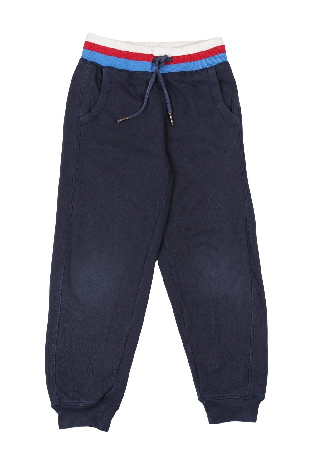 Donkerblauwe sweatbroek met zakken en elastische enkelboord. Gestreepte elastische tailleband en aantrekkoordje.