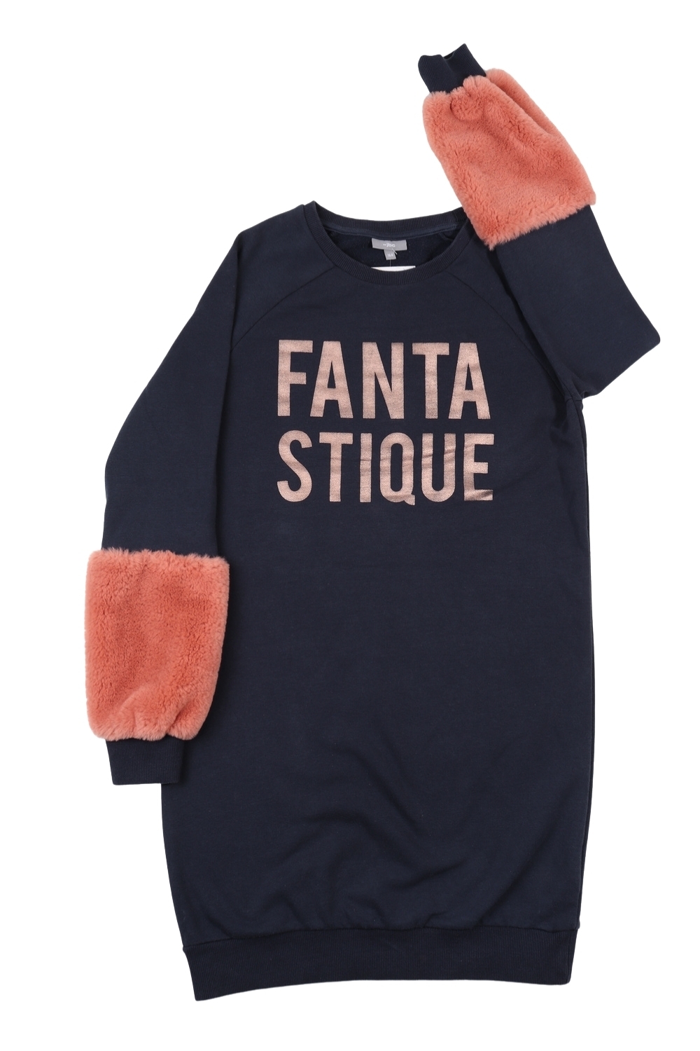 Donkerblauw kleedje in sweaterstof met fluffy oudroze boorden aan de mouwen. Glitterroze opschrift “Fantastique”. Elastische ribboord aan de polsen en onderaan.