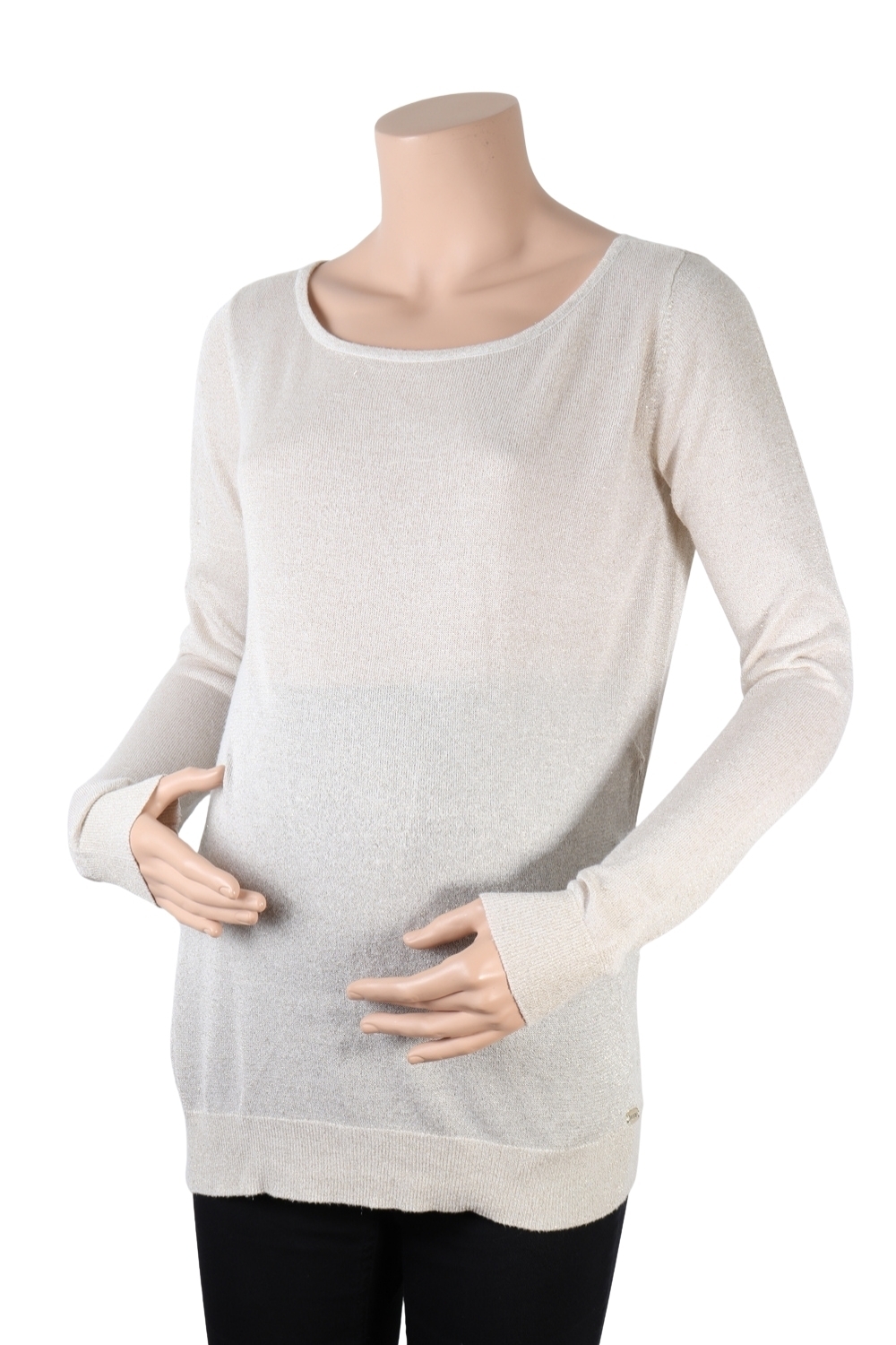 Ecru trui in fijne knit met ingeweven gouddraad. Met mooie uitsnijding op de rug voor een feestelijke toets.